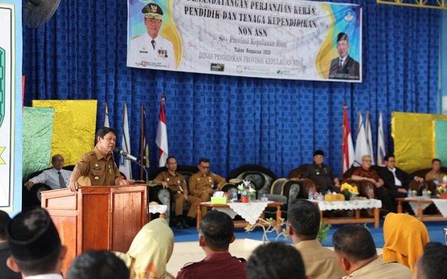 Karimun (Nadariau.com) – Plt Gubernur Kepulauan Riau H Isdianto menyaksikan penandatanganan kontrak kerja pendidikan dan tenaga kependidikan non ASN (GTT) serta penandatanganan pakta integritas bebas narkoba se Provinsi Kepri tahun 2020 di SMKN 1 Karimun, Selasa (28/1).