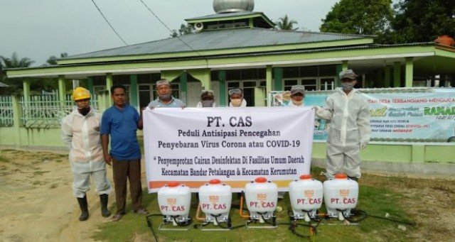 “Kita telah melakukan penyemprotan disinfektan yakni di desa Lipai Bulan Kecamatan Kerumutan dan desa Tambun, Terbangiang Kecamatan Bandar Petalangan, dengan sasaran Tempat Ibadah, Kantor Desa, Puskesmas, Kantor BPD, Warung dan tempat keramaian lainya“, ujar Rivai Manager PT CAS Kebun Terbangiang.