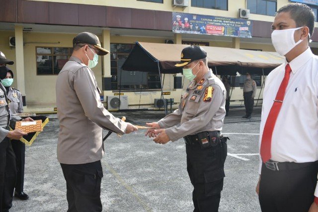 Pekanbaru (Nadariau.com) – Upacara pemberian reward kepada Kapolsek dan 19 personil Polresta Pekanbaru yang berhasil mengungkap kasus Curas dan Curanmor dipimpin Kapolresta Pekanbaru Kombes Pol Nandang Mu’min Wijaya SIK MH, Rabu 17 Juni 2020.