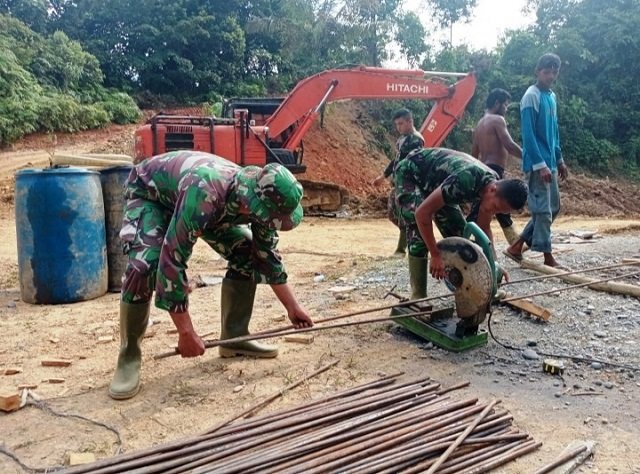 Dengan keikhlasan dan ketulusan, Satgas TMMD tetap bekerja bahu membahu membantu masyarakat memotong besi untuk pembuatan Box Culvert, demi terwujudnya jalan dan jembatan penghubung di Desa Lango, Kecamatan Pante Ceureumen Kabupaten Aceh Barat, Minggu (5/07/2020)