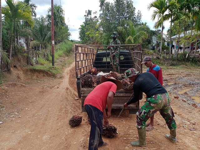 Disamping itu Aden (48) mengatakan sangat bangga melihat semangat anggota TNI yang masih mau membantu warga bekerja menaikan buah sawit keatas mobil.