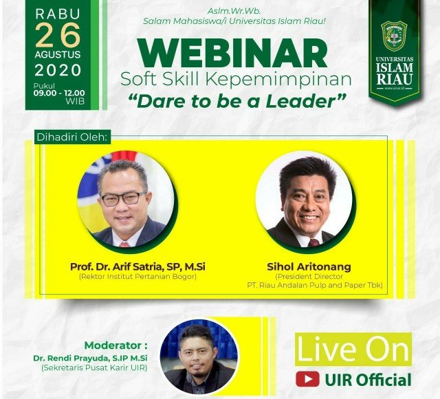 Rencana, webinar yang menghadirkan Rektor Intitut Pertanian Bogor Prof Dr Arif Satria, SP, MSi dan Presiden Direktur PT Riau Andalan Pulp and Paper Tbk Sihol Aritonang, berlangsung secara live on UIR Official pada Rabu (26/08 2020) pukul 09.00 wib.