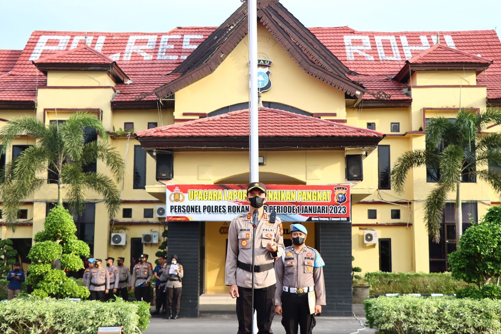 Rokan Hilir, Nadariau Com – Kapolres Rokan Hilir (Rohil)AKBP Andrian Pramudianto SH SIK MSi langsung bertindak sebagai irup upacara laporan kenaikan Pangkat Personel Polres Rohil Periode 1 Januari 2023, yang telah dilaksanakan pada hari Senin 02 Januari 2023 bertempat di Lapangan Mapolres Rohil.