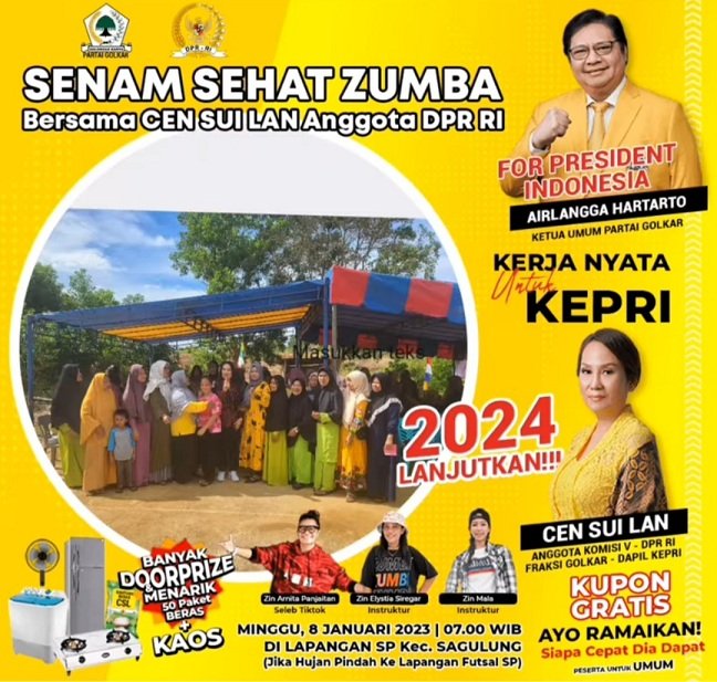 Batam, Nadariau.com – Anggota DPR RI Cei Sui Lan Dapil Kepri akan menggelar senam zumba dengan berbagai doorprize bersama masyarakat, Minggu (8/1/2023) akhir pekan ini.