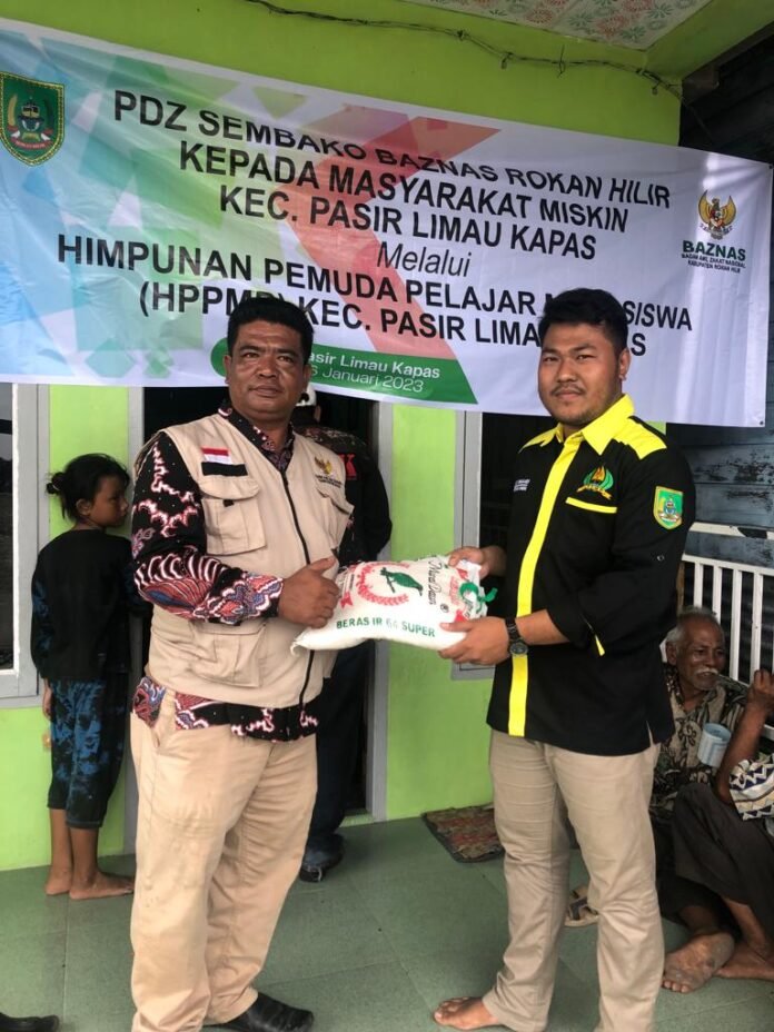 Rokan Hilir, Nadariau Com – Badan Amil Zakat Nasional (BAZNAS) Rokan Hilir melalui Himpunan Pemuda Pelajar dan Mahasiswa Kecamatan Pasir Limau Kapas (HPPMP Pekanbaru) salurkan bantuan sembako bagi masyarakat miskin di Kecamatan Palika, Jumat 06 Januari 2023, Kemaren.