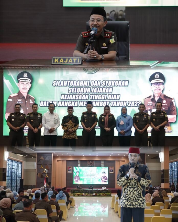 Pekanbaru, Nadariau Com – Kejaksaan Tinggi Riau Silaturahmi dan Syukuran Seluruh Jajaran Kejaksaan Tinggi Riau Dalam Rangka Menyambut Tahun 2023 dan Tausiah oleh Ustad Marhalim, S.Ag dengan tema Mensyukuri Nikmat Allah SWT yang diikuti oleh seluruh pegawai Kejaksaan Tinggi Riau yang beragama islam dan Ibu-ibu IAD Wilayah Riau, bertempat di Ruang Aula HM Prasetio Lt. III Kejaksaan Tinggi Riau, pada Selasa 10 Januari 2023.