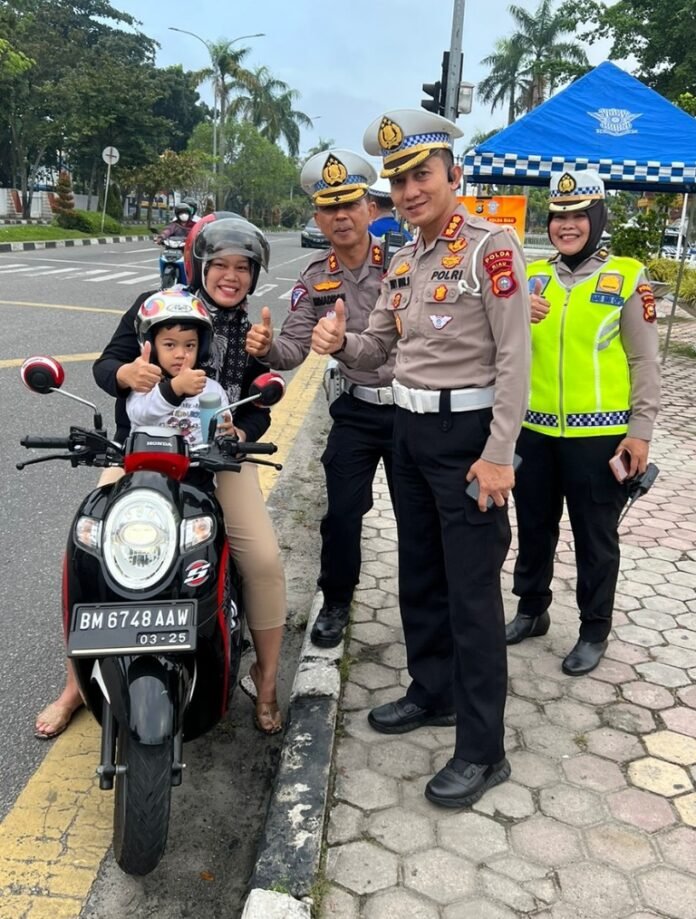 Di lokasi kegiatan berkeselamatan, terlihat Dirlantas Polda Riau menyapa para pengendara Roda Dua maupun pengendara lainnya.