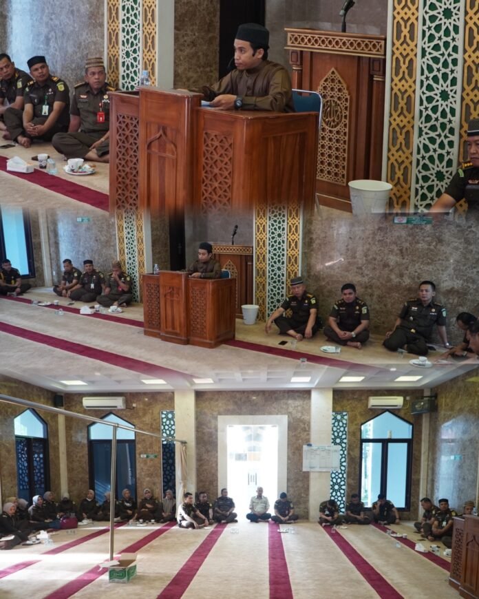 Pekanbaru, Nadariau Com – Kegiatan rutinitas pengajian di Kejati Riau oleh Syaikh Maulana Husen Al Muqri dengan tema Pemegang Sanad Qiroat Cara Baca Al-Quran di Masjid Al-Mizan Kejaksaan Tinggi Riau yang diikuti oleh pegawai di lingkungan Kejaksaan Tinggi Riau, terus bergulir Pada Senin 16 Januari 2023, Sekira pukul 08.30 WIB.