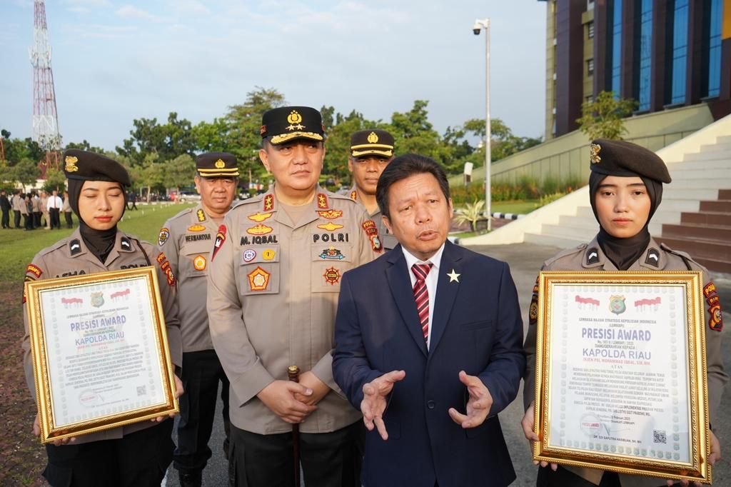 Penghargaan diserahkan langsung oleh Direktur Eksekutif Lemkapi, Edi Saputra Hasibuan kepada Kapolda Riau, Irjen Pol Mohammad Iqbal, saat apel pagi Selasa (21/02/2023) pagi.