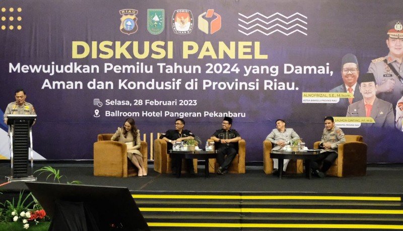 Dalama diskusi panel tersebut menghadirkan sejumlah pembicara yang berkompeten di bidangnya diantaranya Ketua Bawaslu Riau, Alnofrizal, Karo Ops Polda Riau, Kombes Pol R Kasero Manggolo, Ketua KPU Riau, Ilham Muhammad Yasir serta Kaban Kesbangpol Riau, Jenri Salmon Ginting