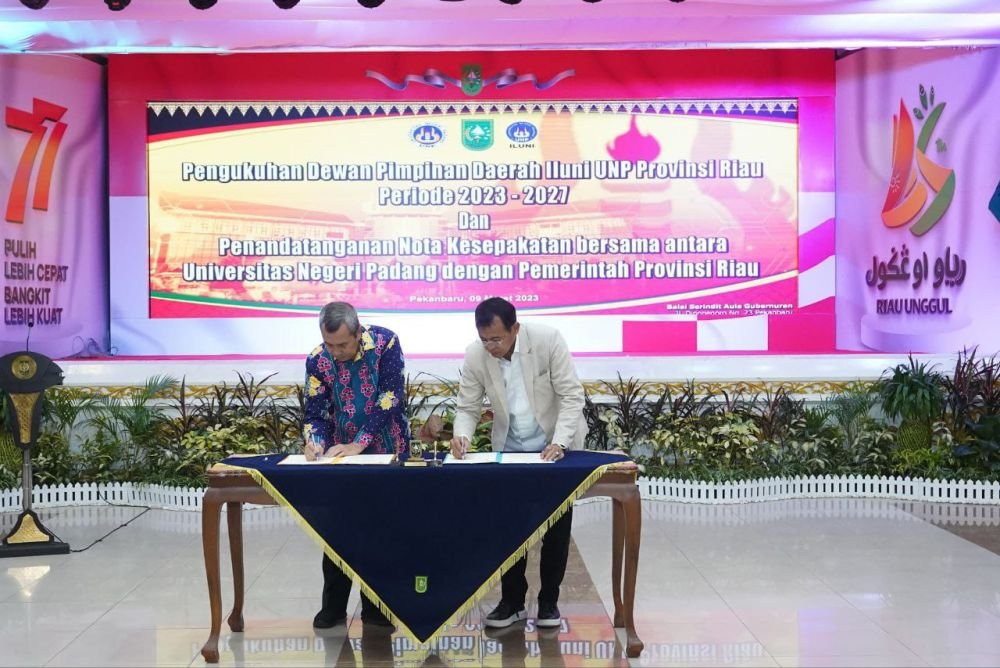 Pekanbaru (Nadariau.com) – Gubernur Riau (Gubri) Syamsuar, bersama Rektor Universitas Negeri Padang (UNP), Ganefri, melakukan penandatanganan nota kesepakatan bersama mengenai pendidikan, penelitian dan pengembangan, serta pengabdian kepada masyarakat dalam rangka pembangunan daerah Provinsi Riau.