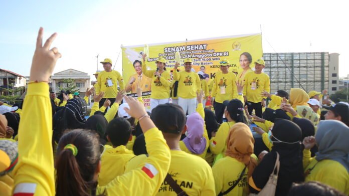 KEPRI, Nadariau.com – Memperkenalkan Ketua Umum Partai Golkar Bapak Airlangga Hartanto sebagai Capres 2024 ke masyarakat pencinta olahraga. Cen Sui Lan mengadakan acara senam bersama kelompok masyarakat Kota Batam. Minggu (12/03/2023) berlangsung meriah dan menyediakan banyak hadiah. Berlokasi di lapangan Nagoya Thamrin City Batam kegiatan ini diramaikan dengan peserta berpakaian dominasi kuning.