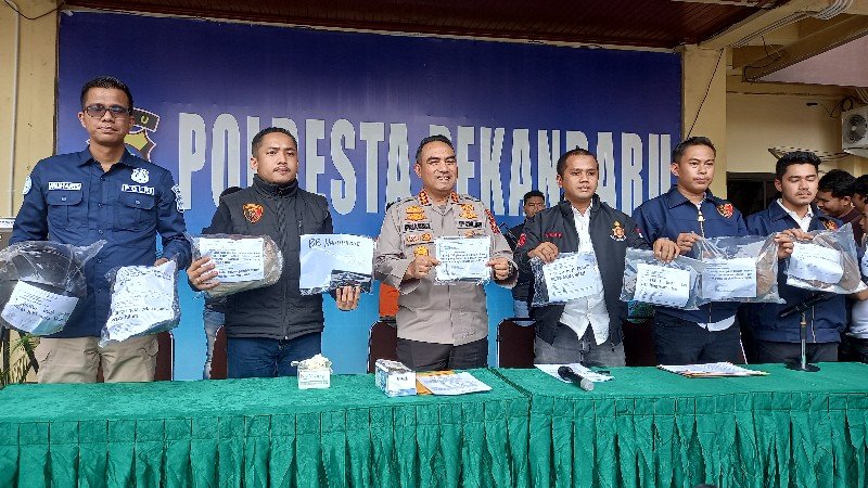 Kapolresta Pekanbaru, Kombes Pol Pria Budi bersama Kasat Reskrim, Kompol Andrie Setiawan memperlihatkan barang bukti
