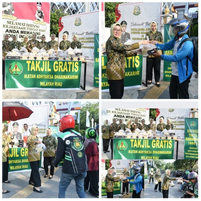 Pekanbaru, Nadariau Com – Ikatan Adhyaksa Dharmakarini (IAD) Wilayah Riau, menggelar kegiatan bakti sosial berupa bagi – bagi takjil kepada masyarakat yang melintas di depan Kantor Kejaksaan Tinggi Riau, Jalan Jendral Sudirman, Kota Pekanbaru Provinsi Riau, Rabu (12/4/2023) sekira pukul 16.30 Wib.