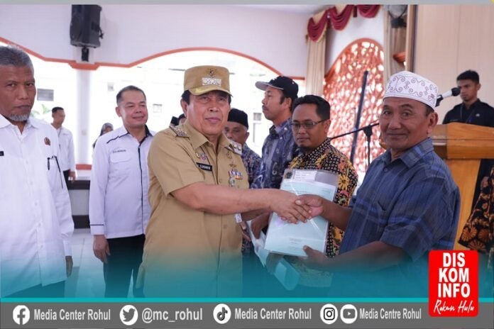 Rohul (Nadariau.com) – Bupati Rokan Hulu (Rohul) Sukiman menyerahkan Sertifikat Hak Milik (SHM) Retribusi Tahun 2023 sebanyak 2.361 Persil kepada masyarakat, yang dipusatkan di Pendopo Rumah Dinas Bupati, Rabu (12/4/2023).