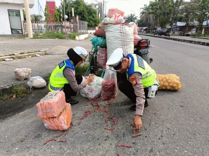 Pekanbaru (Nadariau.com) – Seperti biasa, Anggota Satuan Lalu Lintas melaksanakan pengaturan kelancaran arus lalu lintas dijalan, namun ada yang menarik yang dilakukan oleh Kanit Lantas Polsek Senapelan, IPTU Elva Zilla, pada Jumat (05/05/2023) pagi, dimana dirinya bersama beberapa anggota Lantas Polsek Senapelan nampak memugut cabe yang berserakan di Jalan DI Panjaitan, tepatnya di depan Mapolsek Senapelan.