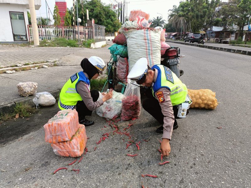 “Saat itu cabe yang diangkut salah seorang pedagang untuk dijual ke pasar Rumbai tumpah di jalan akibat kurang sempurna saat penggangkutannya menggunakan becak motor, melihat hal itu anggota langsung sepontan membantu memugut cabe milik pedagang yang tertumpah tersebut,” kata IPTU Elva Zilla.