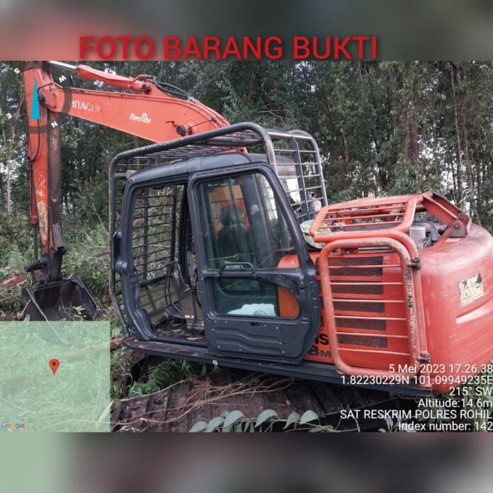 Dikatakannya, adanya Pengungkapan dugaan tindak pidana di Bidang Kehutanan oleh Pihaknya Sat Reskrim Polres Rohil, sebagai respon cepat terhadap laporan di grup yang dikirimkan oleh saksi saudara Jumadi, bahwa ditemukan alat berat excavator merk Hitachi PC 138 warna orange sedang bekerja di areal PT ruas utama jaya tepatnya di blok ruas barat peta 49 9 01 kepenghuluan jumrah.