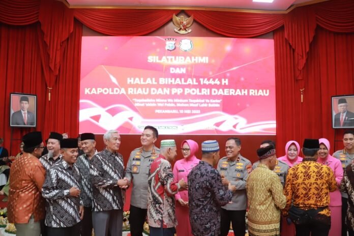 Halal bihalal yang digelar di aula utama lantai lima Mapolda Riau ini diikuti ratusan pensiunan Polri di Riau. Selain Kapolda dan pejabat utamanya, hadir juga Ketua Bhayangkari Riau dan jajarannya. Silaturahmi berlangsung hangat dan sukacita.