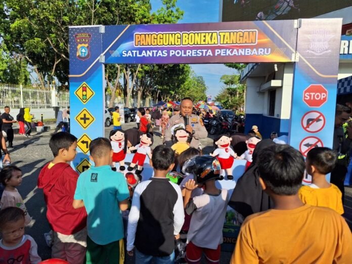 Kegiatan panggung boneka tangan ini di pimpin oleh Kanit Kamsel Satlantas Polresta Pekanbaru AKP Kamaludin, kegiatan berjalan selama pelaksanaan car free day hingga pukul 09.00 Wib.(sony)
