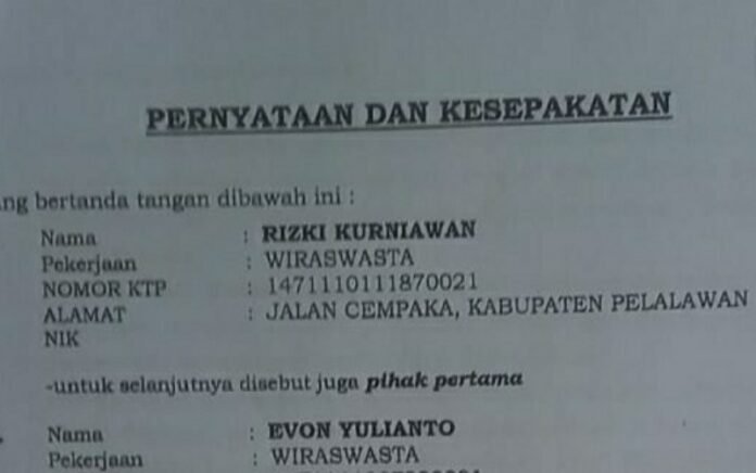 Dimana dalam kesepakan kerjasama antara pelaku penipuan Rizki Kurniawan dengan korban Evon Yulianto terkait kerjasama kegiatan pada Dinas Pendidikan Pelalawan tahun 2022 mencatum nama perusahaan CV Sido Wira Motu sebagai penyedia jasa yang di tandatangani di Kantor Notaris Riki Asfajri.