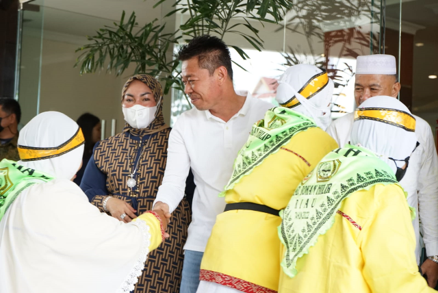 Setelah memberikan selamat, selanjutnya Bupati Rokan Hilir (Rohil) Afrizal Sintong SIP berserta Istri bersalaman kepada seluruh para jamaah haji itu.