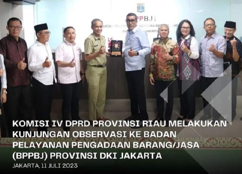 Jakarta (Nadariau.com) – Dalam rangka sharing informasi terkait Pelaksanaan dan Pengelolaan Pengadaan melalui e-Katalog dan e-Order, Komisi IV DPRD Provinsi Riau mengadakan kunjungan observasi ke Badan Pelayanan Pengadaan Barang/Jasa (BPPBJ) Provinsi DKI Jakarta, Selasa (11/7/2023).