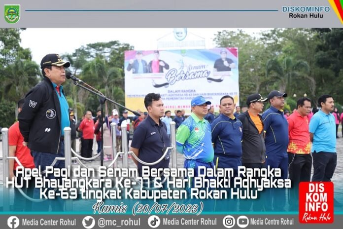 Rohul (Nadariau.com) – Bupati Rokan Hulu Sukiman Memimpin apel Gabungan bersama Polres Rokan Hulu dan Kejaksaan Negeri Rokan Hulu sempena HUT Bhayangkara ke 77 dan Hari Adhyaksa ke 63 tahun 2023 di Halaman Kantor Bupati Rokan Hulu, Kamis (20/07/2023).