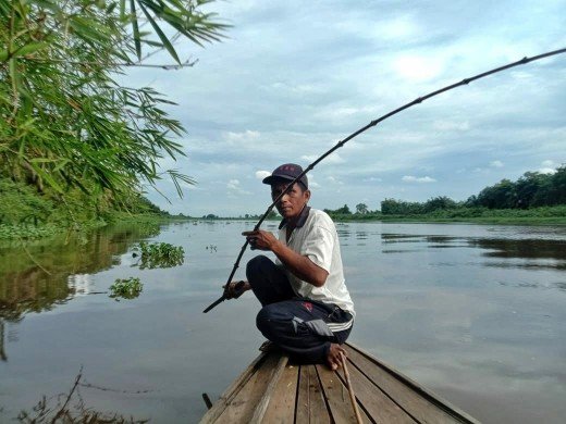 Bapak Nuraini sedang menangkap ikan di Sungai Rokan.