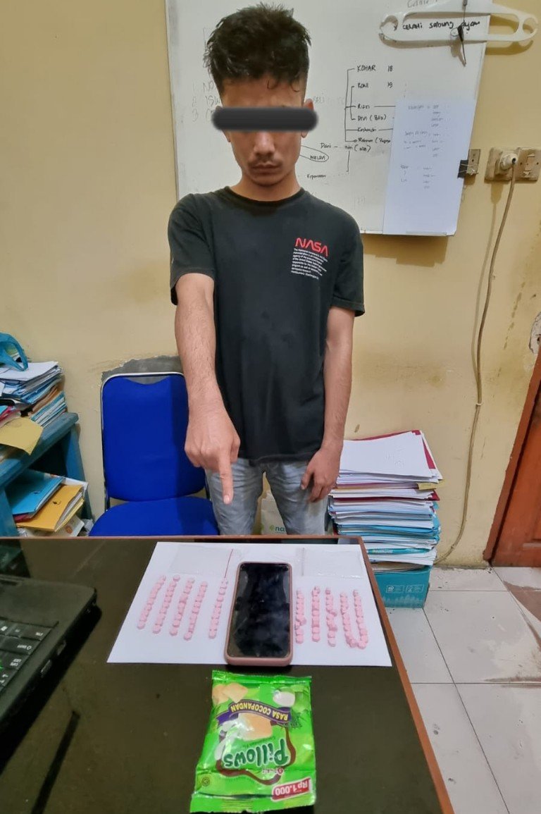 “Lalu tepat di bawah meja pelaku duduk, team menemukan sebuah plastic Snack Pillows warna hijau yang berisikan 100 butir Pil ekstasi Warna merah muda dengan logo tapak panda,” kata Kapolsek.