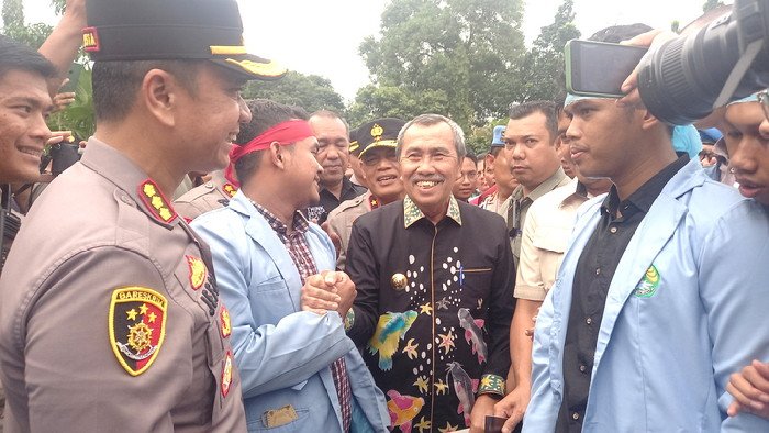 Beberapa lama menggelar orasi, sekitar pukul 16.39 WIB, Gubernur Riau Syamsuar didampingi Wakapolda Riau, Brigjen Kasihan Rahmadi datang menemui massa aksi.
