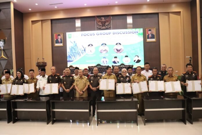 Pekanbaru (Nadariau.com) – Kajati Riau Dr Supardi menggelar FGD Jaga Zona Pertanian, Perekonomian dan Industri (JAGA ZAPIN) dengan tema Upaya Mengatasi Permasalahan di Sektor Perkebunan Sawit di Provinsi Riau serta Penandatanganan Kesepakatan (MOU) antara Bupati dan Walikota dengan seluruh Kejari Jajaran Kejati Riau, Senin (11/09/2023) pagi, di Aula Sasana H.M Prasetyo, Gedung Satya Adhi Wicaksana Kejaksaan Tinggi Riau, Jalan Jenderal Sudirman, Kota Pekanbaru.