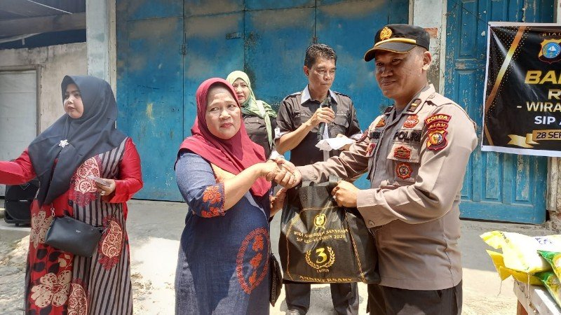 Ketua Alumni SIP Angkatan 49 WAS Polda Riau, IPDA Beny Aswin menyerahkan bantuan paket sembako ke salah satu warga