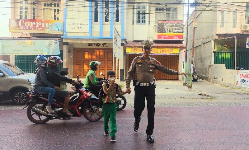 Anggota Polsek Sukajadi Laksanakan Gatur Lalin Bantu Pelajar Sebrangi Jalan