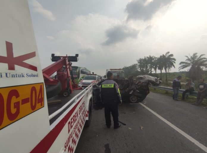 Pekanbaru (Nadariau.com) – Kecelakaan maut kembali terjadi di Tol Pekanbaru-Dumai (Permai), Kali ini melibatkan satu unit minibus Toyota Calya BM 1734 AT yang menabrak bagian belakang mobil Hino Tronton saat melintas di KM 46/200 jalur A, Kecamatan Kandis Kabupaten Siak, Sabtu (04/11/2023) siang. Akibatnya dua penumpang minibus Toyota Calya tewas di tempat lantaran mengalami luka yang cukup serius.