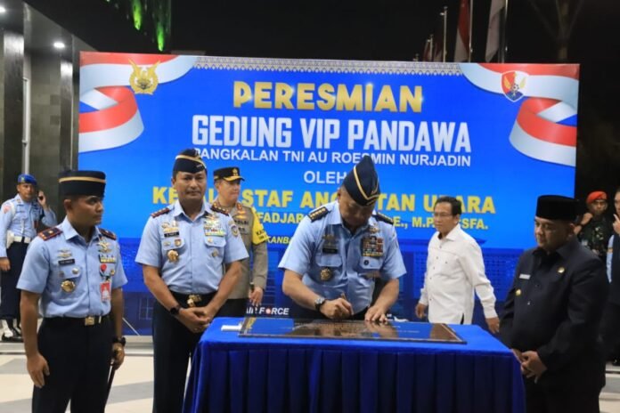 Pekanbaru (Nadariau.com) – Kepala Staf Angakatan Udara (KASAU), Marsekal TNI Fadjar Prasetyo, Rabu (29/11/2023) malam, sekitar pukul 19.30 Wib meresmikan penggunaan gedung VIP Pandawa Pangkalan Udara TNI AU (Lanud) Roesmin Nurjadin, yang direnovasi beberapa waktu lalu. Ditandai dengan penandatangan prasasti dan pengguntingan pita.