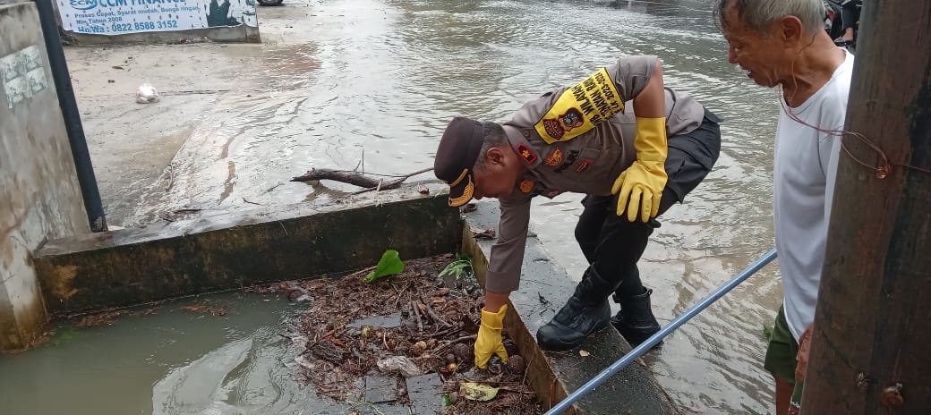 Untuk mengurangi genangan air dan mengantisipasi kemacetan, personil Polsek bersama Kapolsek Tenayan Raya langsung melakukan pembersihan pada parit yang tergenang air.