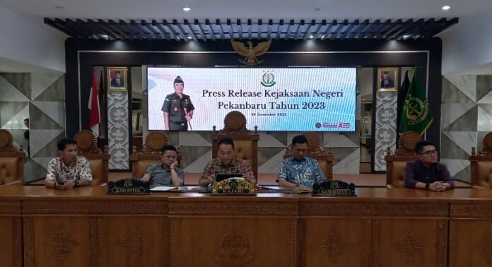 Didampingi Kasi Intel Lasargi Marel, Kasi Datun Zikrullah serta pejabat lainnya, Asep memaparkan sejumlah pencapaian dan penanganan perkara di Kejari Pekanbaru selama tahun 2023.