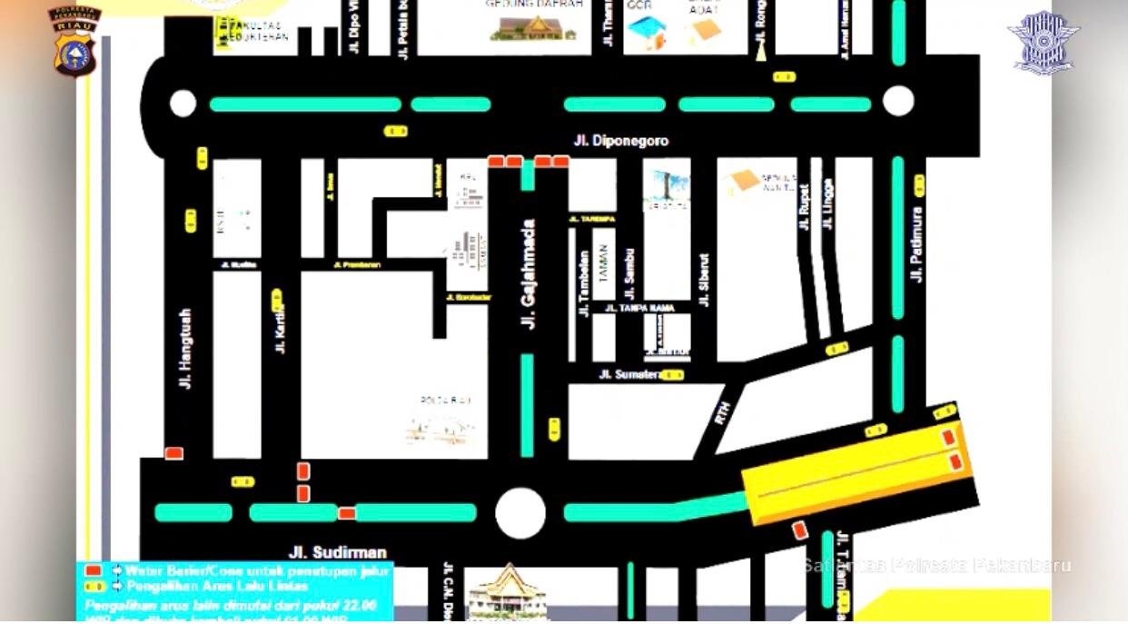 Satlantas Polresta Pekanbaru akan melakukan penutupan akses total Jalan Gajah Mada, Flyover Simpang Tuanku Tambusai- Jenderal Sudirman dari arah Arena Purna MTQ dan Tugu Zapin mulai dari Persimpangan Jalan Hang Tuah-Jenderal Sudirman untuk kendaraan dari arah Pasar Bawah.