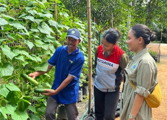 Seorang penerima manfaat Program Desa Energi Berdikari PHR, di Desa Mukti Sari, Kecamatan Tapung, Kampar memperliahtkan hasil perkebunan mentimunnya yang tumbuh subur menggunakan bioslurry.