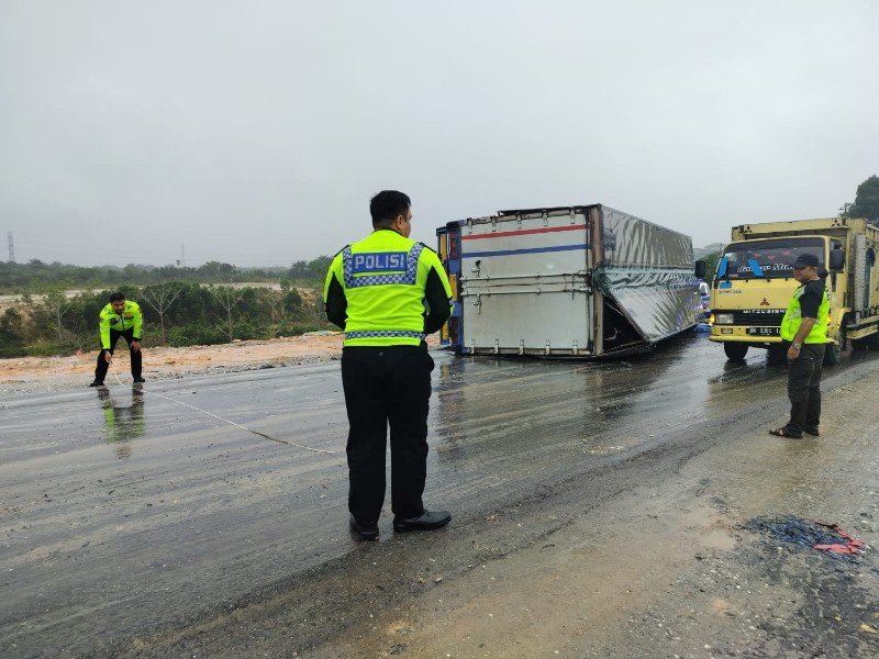 Terlibat Kecelakaan, Truk Tronton di Pekanbaru Terbalik Usai Tabrak Bus
