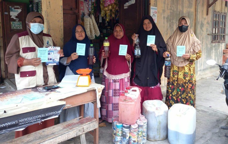 Sejumlah warga yang menjadi nasabah saat menyetorkan minyak jelantah kepada Bank Jatah Karang Taruna Umban Sari binaan PT PHR di, Rumbai, Pekanbaru.
