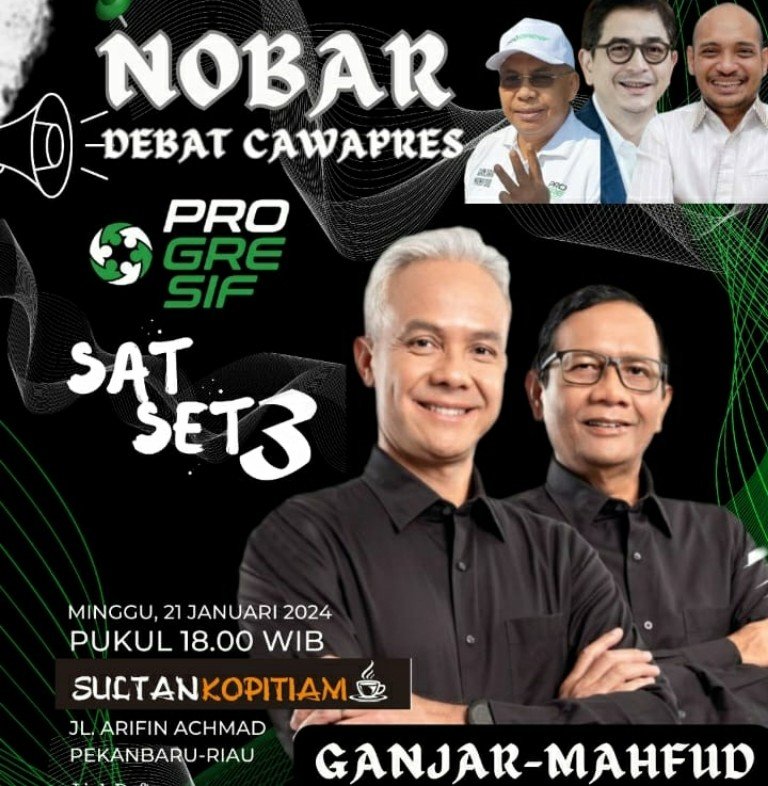 Pekanbaru (Nadariau.com) – Relawan 03 Ganjar-Mahfud yang tergabung dalam Program Gotong Royong untuk Ekonomi Sejahtera dan Inklusif (Progresif) Wilayah Riau kembali menggelar Nonton Bareng Debat (Nobat) Cawapres serentak di 38 provinsi di Indonesia pada Minggu, 21 Januari 2024 pukul 18.00 WIB.
