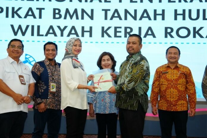 Sertipikat diserahkan Kepala Kanwil BPN Riau Asnawati berjenjang kepada EVP Upstream Business PHR WK Rokan Edwil Suzandi, dan PHR menyampaikan kepada Kepala Departemen Pertanahan SKK Migas, Farida di Pekanbaru, Selasa (24/1/2024) disaksikan Kepala Departemen Formalitas dan Komunikasi SKK Migas Sumbagut, Yanin Kholison. SKK Migas merupakan Kuasa Pengguna BMN Tanah dari Menteri Keuangan RI.