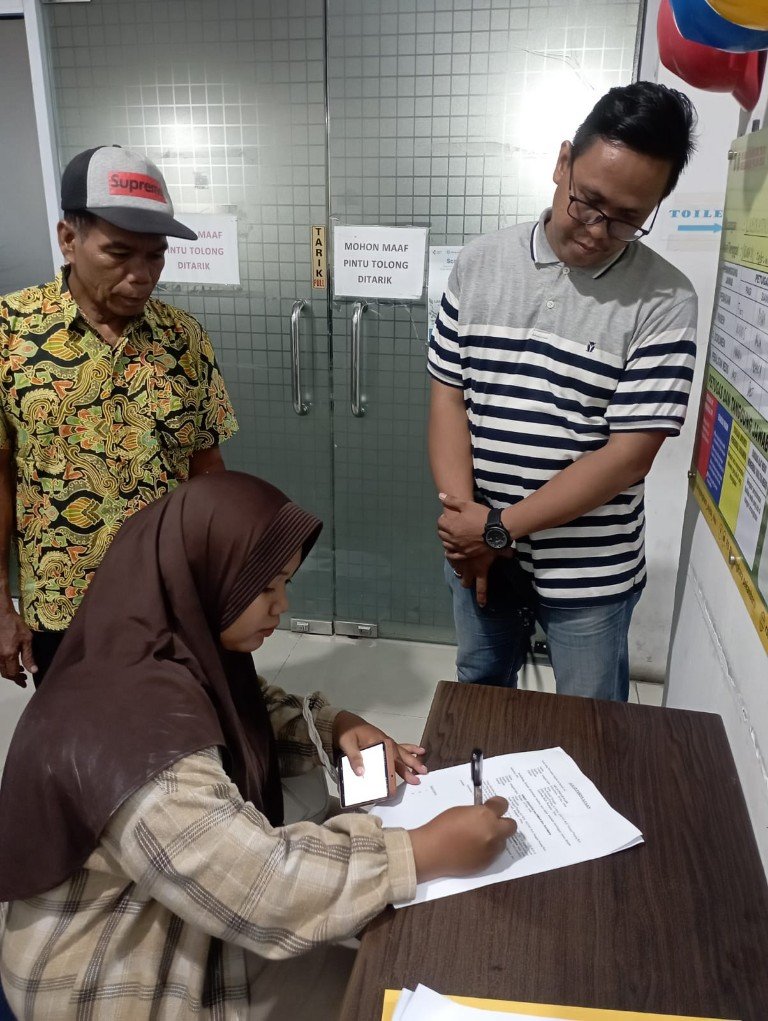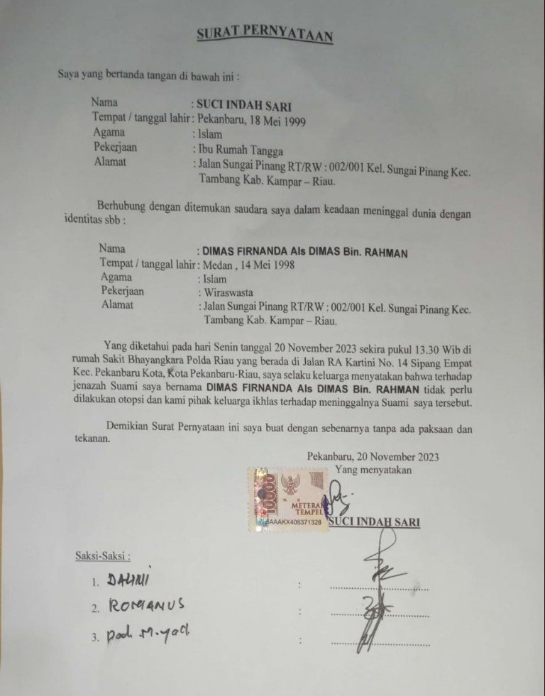 Lalu kemudian istri korban menandatangi surat pernyataan tersebut disaksikan oleh pengacara dan 2 orang keluarga korban.