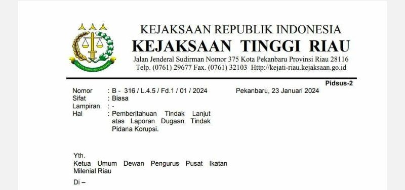 Pekanbaru (Nadariau com) – Kejaksaan Tinggi (Kejati) Riau resmi memanggil Ketua Umum Ikatan Milenial Riau (IMR) terkait laporan yang diajukan Ikatan Milenial Riau pada 21 Desember 2023 lalu, terkait dugaan kongkalikong penerbitan Izin Pemanfaatan Kayu (IPK) PT WSSI oleh Pemerintah Provinsi (Pemprov) Riau pada tahun 2021 silam.