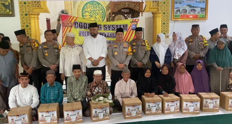 Diakhir acara, Kombes Jeki menyerahkan bantuan paket sembako kepada warga kurang mampu serta memberikan bantuan kepada pengurus Masjid AL – Mukminin.