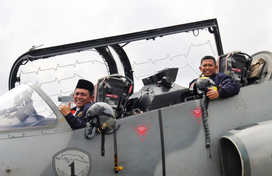 Gubernur Ansar didampingi Danlanud RHF Kolonel PNB Andi Nur Abadi pun sempat menjajal kokpit salah satu pesawat tempur Hawk 100/200 tersebut.