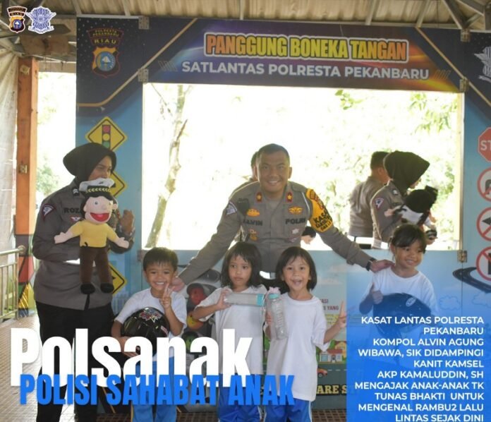 Kasat Lantas Polresta Pekanbaru, Kompol Alvin Agung Wibawa di dampingi Kanit Kamsel AKP Kamaludin berserta personil Satlantas memberikan edukasi kepada anak-anak dari TK Tunas Bakti.