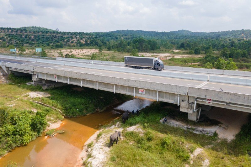 Gajah Sumatera bernama Codet melintasi terowongan di bawah tol Pekanbaru-Dumai saat menjelajah di Kantong Giam Siak Kecil dan Balai Raja.